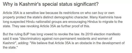 這里需要注意的是,當(dāng)年印度為了維持這個[查謨和克什米爾邦]的穩(wěn)定、安撫當(dāng)?shù)氐哪滤沽置癖姾痛_保其“效忠”印度,曾同意在印度的憲法中(第370條款)給予當(dāng)?shù)匾粋€“特殊地位”,即允許當(dāng)?shù)負(fù)碛凶约旱膽椃ā⑵鞄?,以及除了國防、通訊和外交事?wù)外的獨(dú)立決策權(quán)。甚至為了維護(hù)當(dāng)?shù)靥厥獾娜丝诮Y(jié)構(gòu),印度隨后還同意在憲法中(第35a條款)禁止其它地方的人在當(dāng)?shù)刭徺I房產(chǎn)、定居、和成為當(dāng)?shù)氐墓珓?wù)員。當(dāng)?shù)嘏尤绻c外地人結(jié)婚,那么她和她的子女也將失去在當(dāng)?shù)負(fù)碛挟a(chǎn)權(quán)的權(quán)利。