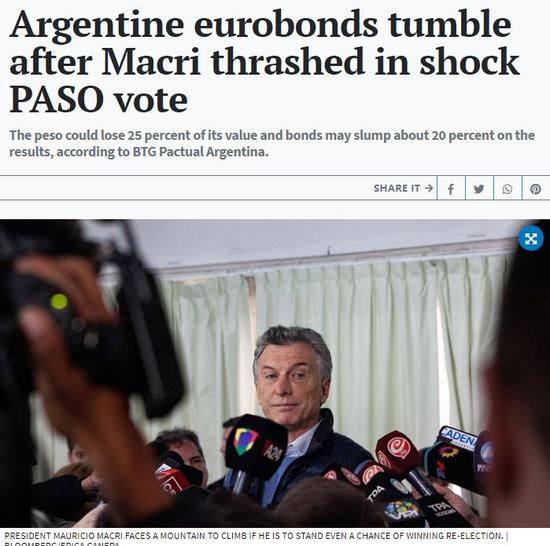 初選的結(jié)果被許多人視為阿根廷10月27日第一輪總統(tǒng)選舉的一個(gè)關(guān)鍵指標(biāo),也被認(rèn)為是一個(gè)明確的信號(hào),表明阿根廷選民準(zhǔn)備拒絕馬克里政府嚴(yán)厲的經(jīng)濟(jì)政策。阿根廷股匯債的暴跌,也促使分析師們紛紛發(fā)出警告,金融市場(chǎng)更是普遍存在恐慌。