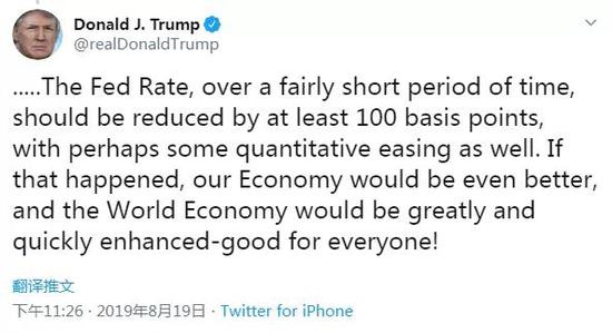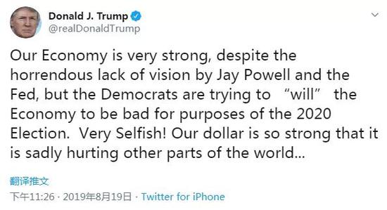 據(jù)臺(tái)灣《經(jīng)濟(jì)日?qǐng)?bào)》8月20日?qǐng)?bào)道,特朗普在推特對(duì)美聯(lián)儲(chǔ)開炮,他表示:“盡管美聯(lián)儲(chǔ)和主席鮑威爾嚴(yán)重缺乏遠(yuǎn)見,美國(guó)經(jīng)濟(jì)依然強(qiáng)勁,但民主黨為了2020年大選,竟‘希望’經(jīng)濟(jì)不好,太自私了!美元現(xiàn)在太強(qiáng),已經(jīng)嚴(yán)重傷害世界其他國(guó)家的經(jīng)濟(jì)。至于美聯(lián)儲(chǔ)的利率,應(yīng)該在短期內(nèi)調(diào)降至少100個(gè)基點(diǎn),或許還得推出一些量化寬松措施。果真如此,美國(guó)的經(jīng)濟(jì)會(huì)更好,世界經(jīng)濟(jì)會(huì)獲得極大和快速的提升。”報(bào)道稱,在全球增長(zhǎng)趨緩、貿(mào)易爭(zhēng)端充滿不確定性之際,美聯(lián)儲(chǔ)上個(gè)月已進(jìn)行10年來首度降息,并對(duì)未來進(jìn)一步降息持開放態(tài)度。對(duì)經(jīng)濟(jì)前景的展望不佳,引發(fā)金融市場(chǎng)震蕩,也令美國(guó)國(guó)債利率頻創(chuàng)紀(jì)錄低點(diǎn),反映投資人押注美聯(lián)儲(chǔ)會(huì)再度采取寬松政策。