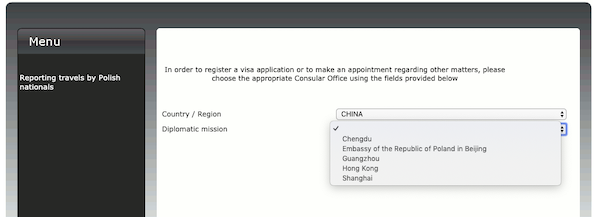 私家地理嘗試登陸了電子領(lǐng)事系統(tǒng)www.e-konsulat.gov.pl,發(fā)現(xiàn)目前它還沒有中文版,英文版申請系統(tǒng)中僅開放成都,北京,廣州,香港和上海五個申請地選擇,并有說明,只有這五地居民或暫住證持有者才可申請簽證。不過,9月2日后線上申請才將真正開放,讓我們拭目以待。