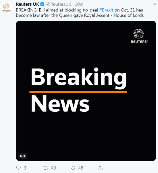 如今女王批準(zhǔn)反對“無協(xié)議脫歐”法案,這意味著在法律層面,約翰遜將不能實(shí)行“無協(xié)議脫歐”。此間觀察人士認(rèn)為,除非英國在10月19日歐盟峰會結(jié)束之前與歐盟達(dá)成新的“脫歐”協(xié)議,否則約翰遜將不得不尋求歐盟同意推遲“脫歐”。