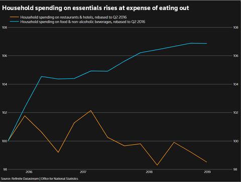 自2016年以來(lái),家庭支出仍然支撐著英國(guó)經(jīng)濟(jì)。然而有跡象表明,家庭在食品等非自由支配的商品上花費(fèi)更多,而在餐館和酒店的支出卻有所減弱。