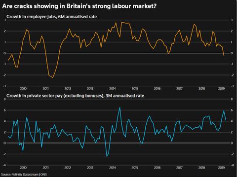 勞動(dòng)力市場(chǎng)是英國(guó)經(jīng)濟(jì)的強(qiáng)項(xiàng),但近年來(lái)出現(xiàn)了一些下滑。就業(yè)人數(shù)在2019年前七個(gè)月有六個(gè)月呈現(xiàn)大幅下降趨勢(shì)。盡管英國(guó)央行(EOC)曾表示,經(jīng)濟(jì)增長(zhǎng)可能已經(jīng)達(dá)到頂峰,生產(chǎn)率也沒(méi)有回升,但工資增長(zhǎng)仍處于10年來(lái)的最高水平。