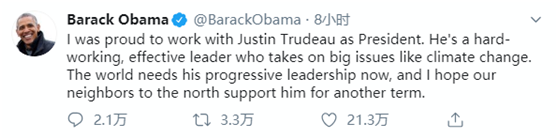 在特魯多發(fā)表講話幾個小時后,奧巴馬推特發(fā)文支持特魯多,稱后者“在處理氣候變化等重大議題上是一位勤奮、高效的領導人”,“這個世界現(xiàn)在需要他穩(wěn)健的領導力,我希望我們的北方鄰居支持他的連任。”