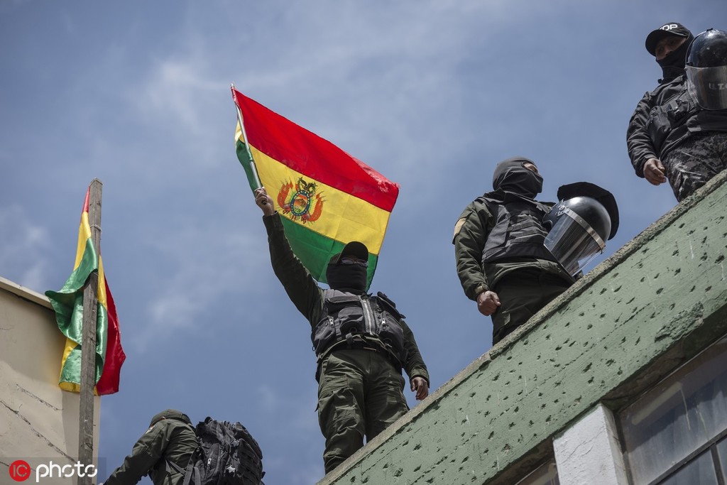 11月9日,拉巴斯也有警察站在警局的屋頂揮舞國旗抗議 圖源:IC Photo 與此同時,還有示威者闖入拉巴斯一間國營電視臺及一間電臺的辦公室,下令40多名職員離開,指控他們?yōu)槟R斯服務(wù)。莫拉萊斯對此批評稱:“他們宣稱捍衛(wèi)民主,但他們的行為如同獨裁政權(quán)。”
