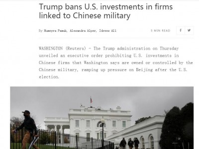 路透社消息,11月12日,特朗普政府公布了一項(xiàng)行政命令,禁止美國企業(yè)對部分中國公司的投資,限制對象「由中國軍方擁有或控制」的企業(yè)