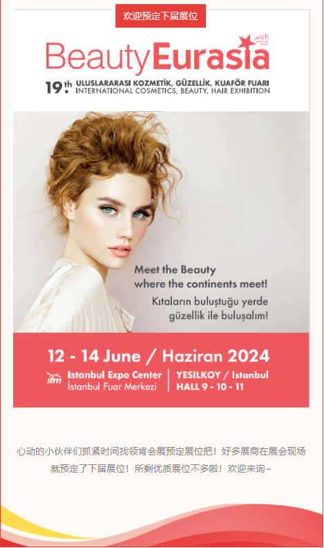 Beauty Eurasia是土耳其和歐亞最大的化妝品展之一,展示了化妝品以及美容行業(yè)相關(guān)的產(chǎn)品和服務(wù),是美容行業(yè)心臟跳動(dòng)的地方。Beauty Eurasia旨在討論該行業(yè)的全球和區(qū)域發(fā)展,并為信息交流提供基礎(chǔ)。該展覽還提供了新的想法和產(chǎn)品,每年在土耳其舉行,接待了來自世界各地的無數(shù)專家參與,該展會(huì)2023年接待了約350家參展商和約18000名觀眾,是土耳其化妝品行業(yè)必不可少的展會(huì),展示了領(lǐng)先的產(chǎn)品和服務(wù)。