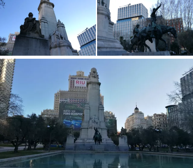 西班牙廣場是1930年為紀念塞萬堤斯而建造的,廣場中央的塞萬堤斯雕像似乎正俯視著唐吉訶德像和桑喬潘沙(Sancho Panza)雕像,很多游客都喜歡跟唐吉訶德的雕像拍照,以示到此一游,廣場上還有一些流動小商販賣特色紀念品。
