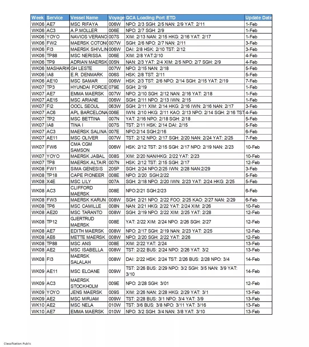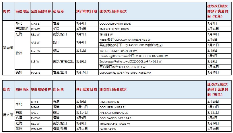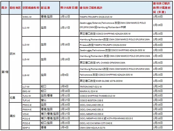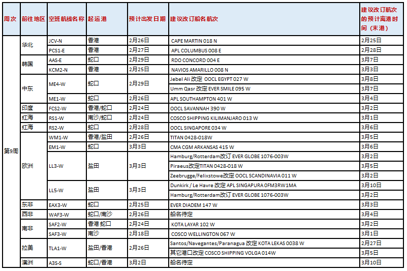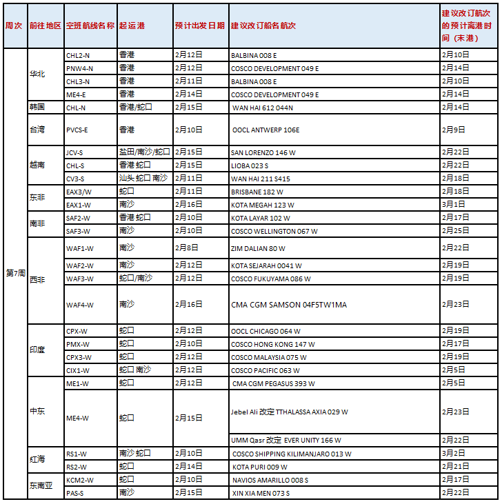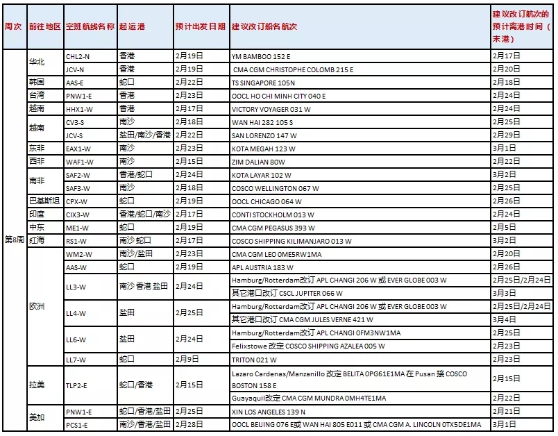 航線方面,受公眾假期延長及后續(xù)需求放緩影響,以下航線船舶將進(jìn)行調(diào)整,具體安排 如下:
