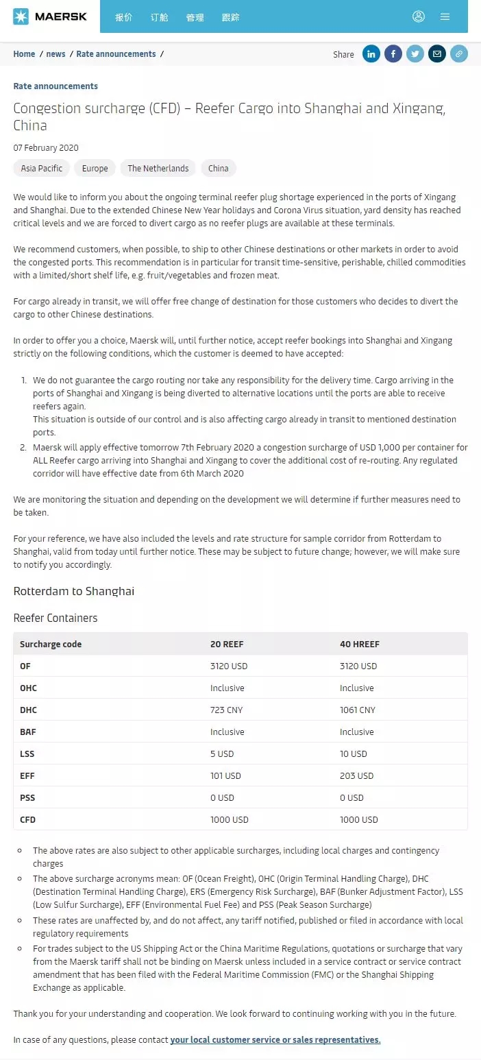 馬士基關(guān)于收取擁堵附加費(fèi)的通知: