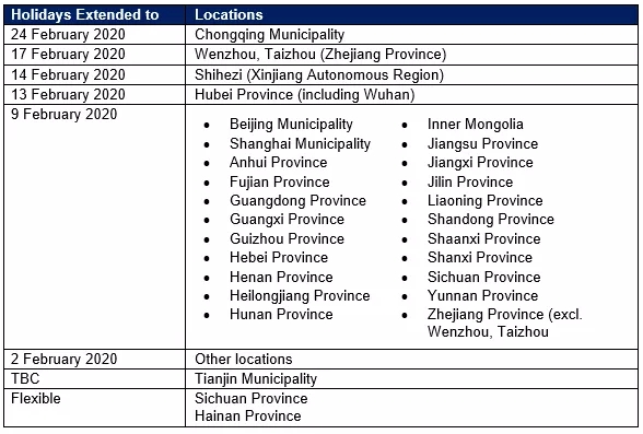 因應(yīng)新冠肺炎疫情,除中國國務(wù)院通告延長春節(jié)假期外,各省市政府也陸續(xù)公布延遲復(fù)工的通知,以減少人員齊聚、控制疫病傳播,對(duì)此,本公司配合各地防疫政策公告中國各辦公室復(fù)工動(dòng)態(tài)如下: