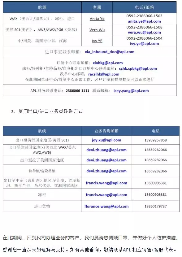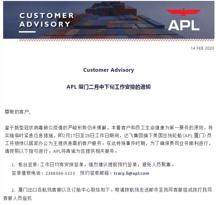 APL最新工作安排通知及各地堆場(chǎng)最新開放情況
