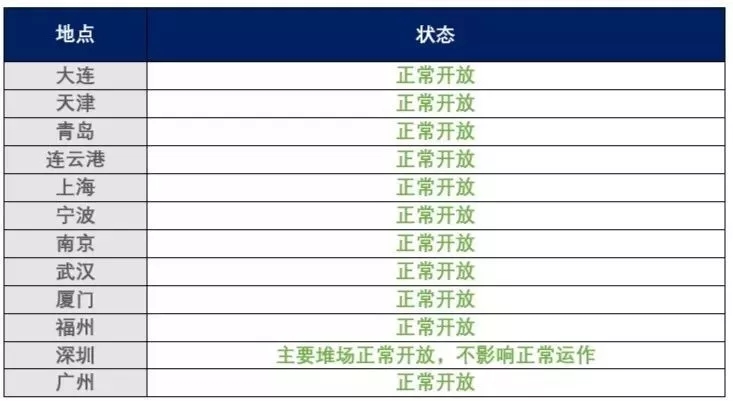所有海運(yùn)碼頭堆場(chǎng)正常提供服務(wù),提空柜還重柜均正常進(jìn)行。所有外堆場(chǎng)均已恢復(fù)運(yùn)營。