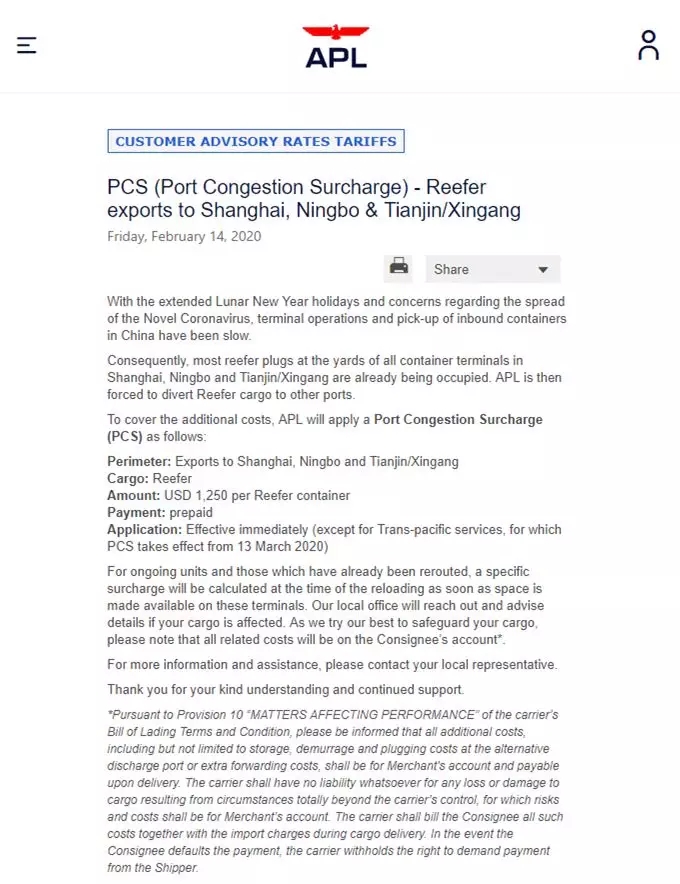 APL14日起對(duì)出口至上海港、寧波港和天津新港的冷藏箱,收取每箱1250美元港口擁堵附加費(fèi),具體如下: