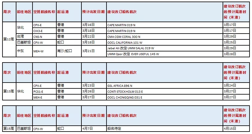 因受春節(jié)假期延期和疫情影響,東方海外針對(duì)近期的情況對(duì)亞洲、歐洲、美洲,拉丁美洲和非洲等多個(gè)航線及港口船期作出了調(diào)整。小編在此整合了從第7周至15周的空班時(shí)刻表和備選方案供大家參考以便及時(shí)安排出貨等事宜。