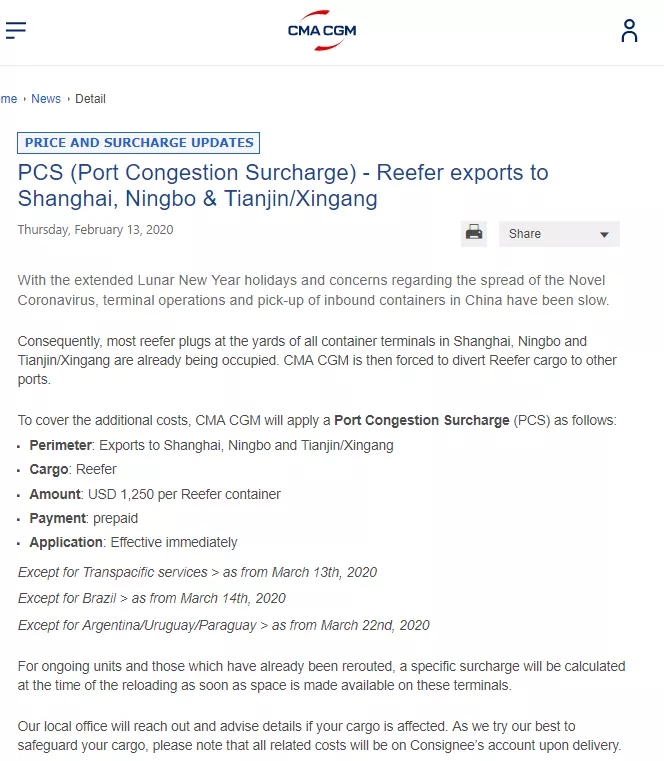 2.從2020年2月12日起,HMM將對(duì)所有前往上海、寧波和新港的冷凍箱訂艙收取每箱1000美元的擁堵附加費(fèi),以支付不可預(yù)估的轉(zhuǎn)運(yùn)和在替代港口延長停留時(shí)間的額外費(fèi)用。對(duì)于某些特定航線,此附加費(fèi)將從2020年3月12日起生效。