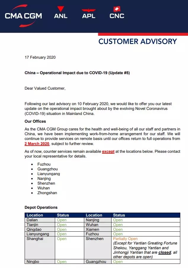 馬士基大中華區(qū)各地辦公室恢復(fù)運(yùn)營情況請(qǐng)參考下圖,員工的健康和安全是我們工作的 重中之重,因此,絕大部分馬士基員工保持在家遠(yuǎn)程辦公。與此同時(shí),我們的柜臺(tái)業(yè)務(wù) 仍正常運(yùn)行,服務(wù)客戶無間斷。我司寧波辦公室所在寫字樓,現(xiàn)正配合當(dāng)?shù)卣? 等待政府復(fù)工審批,為此我們對(duì)寧波柜臺(tái)服務(wù)設(shè)置了特別的操作流程,詳情請(qǐng)咨詢當(dāng)?shù)?客戶服務(wù)代表。