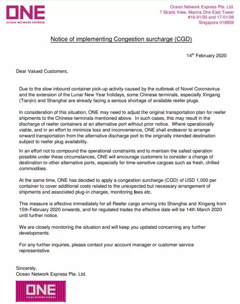 從2月7日起,對(duì)進(jìn)入上海和天津新港的冷藏箱貨物加收每箱1000美元的擁堵費(fèi),以支付中心規(guī)劃航線的額外費(fèi)用,部分航線生效日期為3月6日。