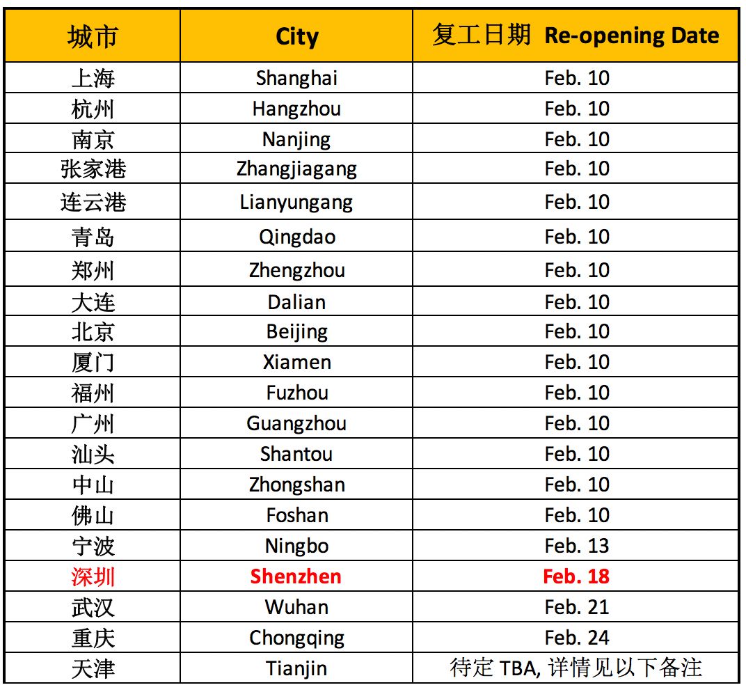 一、2月17日(周一)正常復(fù)工辦事處:北京,大連,青島,臨沂,蘇州,上海,杭州,義烏,福州,廈門,深圳,廣州,廣州資訊,佛山,汕頭,湛江,南寧;寧波,中山,東莞 將于2月19日(周三)復(fù)工。