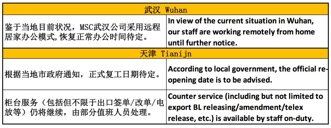 上班的方式,部分員工在辦公區(qū)域工作,部分員工居家連線在崗,為客戶提供必需及時(shí)的服務(wù)。由于各地方政府對(duì)疫情防控的不同要求,特此更新MSC在中國大陸下述城市的辦公室最新復(fù)工情況: