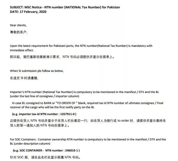 MSC:巴基斯坦-->提單必須提供NTN號(hào)碼