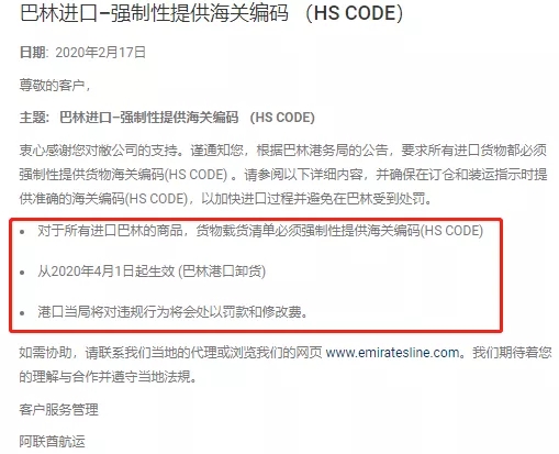 阿聯(lián)酋航運(yùn)發(fā)布通知:根據(jù)巴林港務(wù)局最新公告,要求所有進(jìn)口巴林的貨物都必須提供貨物海關(guān)編碼(HS CODE)。具體要求如下: