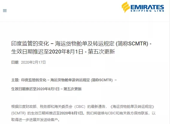 根據(jù)印度財(cái)政部、稅務(wù)部和海關(guān)委員會(huì)(CBIC)的最新通告,《海運(yùn)貨物艙單及轉(zhuǎn)運(yùn)規(guī)定》 (SCMTR) 的生效日期將推遲至2020年8月1日。具體如下: