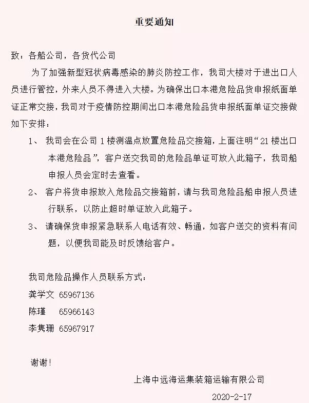 中遠(yuǎn)海運(yùn)出口上海港危險(xiǎn)品貨申報(bào)交接通知