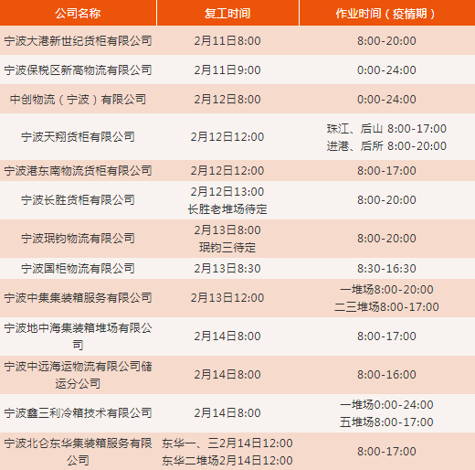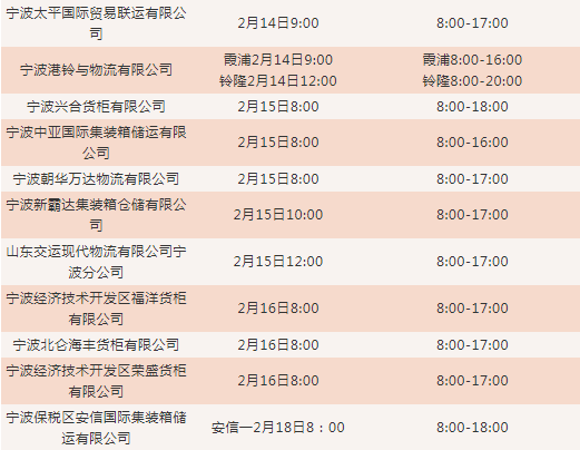 寧波各堆場(chǎng)復(fù)工時(shí)間及疫情期間作業(yè)時(shí)間: